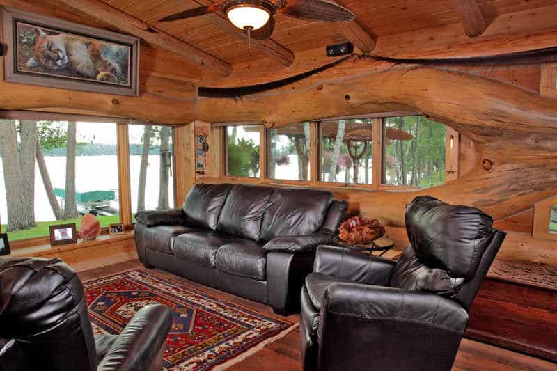 The most eye-catching thing about a 130-year-old, slingshot-shaped log that is fixed along the family room wall, acting as a frame for a bank of four windows may be that exotic feature. This remarkable piece of wood not only adds a dramatic touch to the room but also nicely frames the amazing view of the lake.