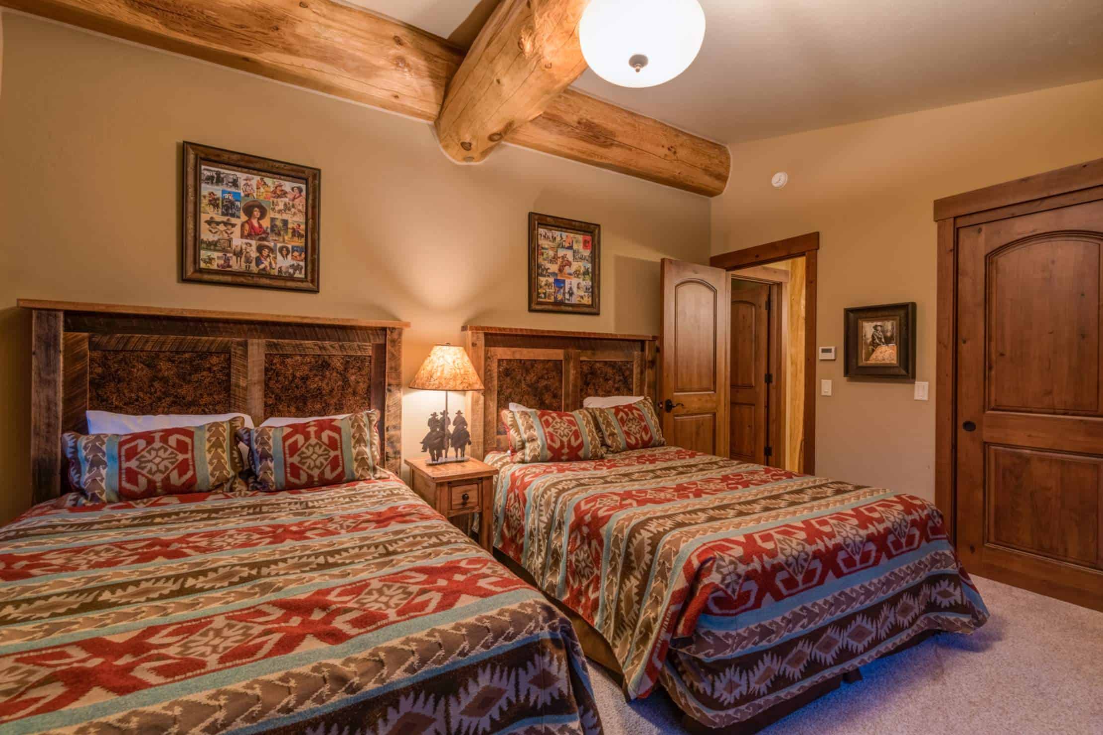 Adding to the cabin’s distinctive personality are subtle, yet evocative, decorative elements. A magnificent wood carving of a mounted moose adorns the wall, lending the space its namesake and an undeniable Rocky Mountain authenticity. The ambiance is further enhanced by carefully selected lighting, including unique antler lamps that cast a warm glow over the rustic yet refined furnishings.